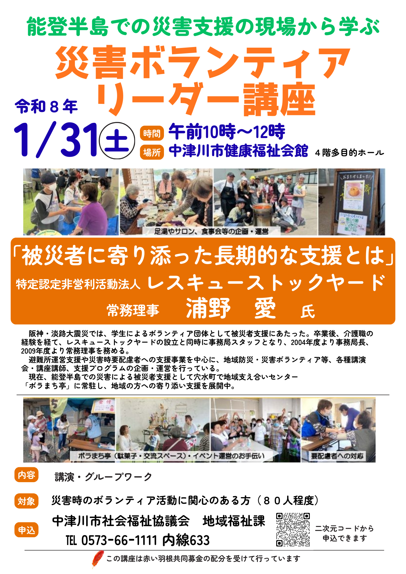 今回は「災害ボランティアセンター」開設後、被災者との寄り添い長期的な支援を行う「地域支え合いセンター」の役割などについて、能登半島地震などにより被災した穴水町の支援の事例などを通じて今後、中津川が大規模災害が発生した際の取り組みに活かすためのヒントを学びます。