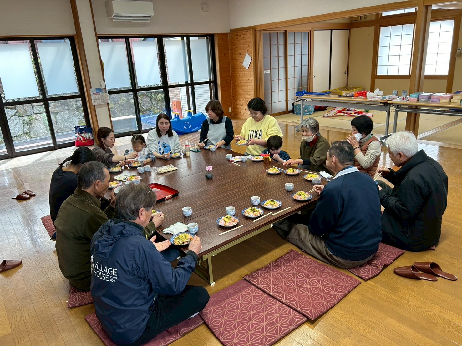子育て親子や19区の役員さん、民生委員児童委員さん、地域福祉推進員さんなど16人が参加し、みんなでビンゴ大会やお昼ご飯を食べたり、楽しいひとときを過ごしました。