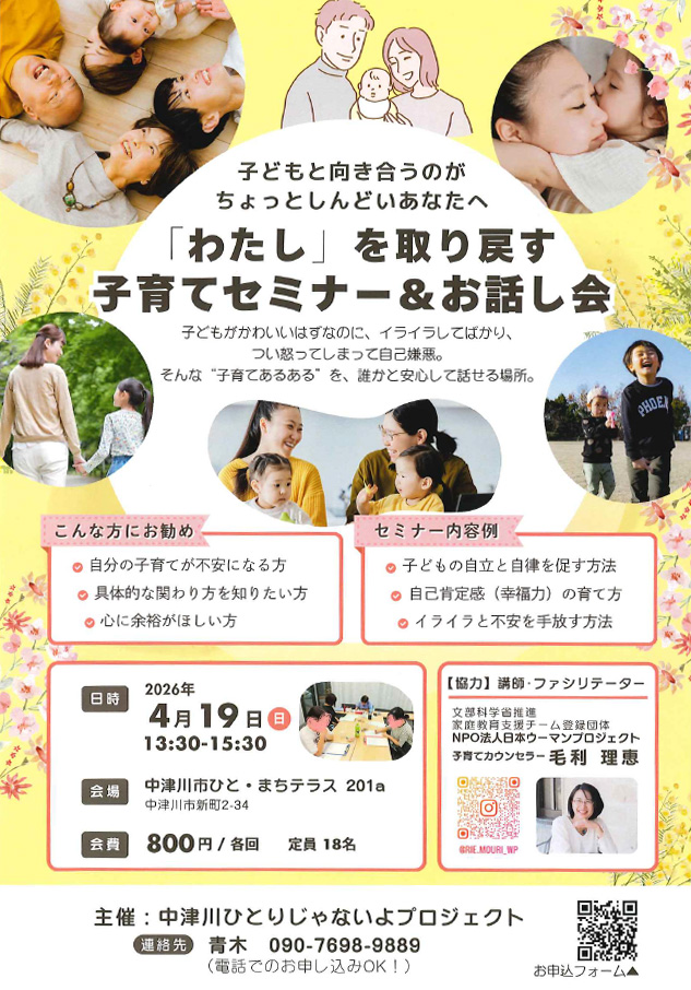 中津川ひとりじゃないよプロジェクトよりお知らせ ~子育てセミナー&お話し会~