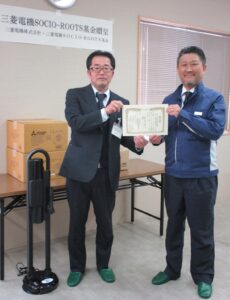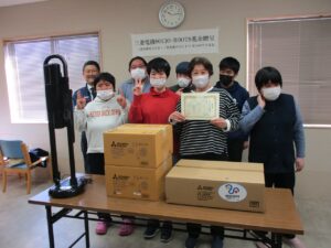 3月12日(木)、「三菱電機SOCIO-ROOTS(ソシオルーツ)基金」様から、中津川市障がい者就労支援事業所てがのへ、三菱電機 壁掛け扇風機2台、ヘルスエアー1台、コードレスクリーナー1台 合計350,000円相当の寄贈をいただきました。