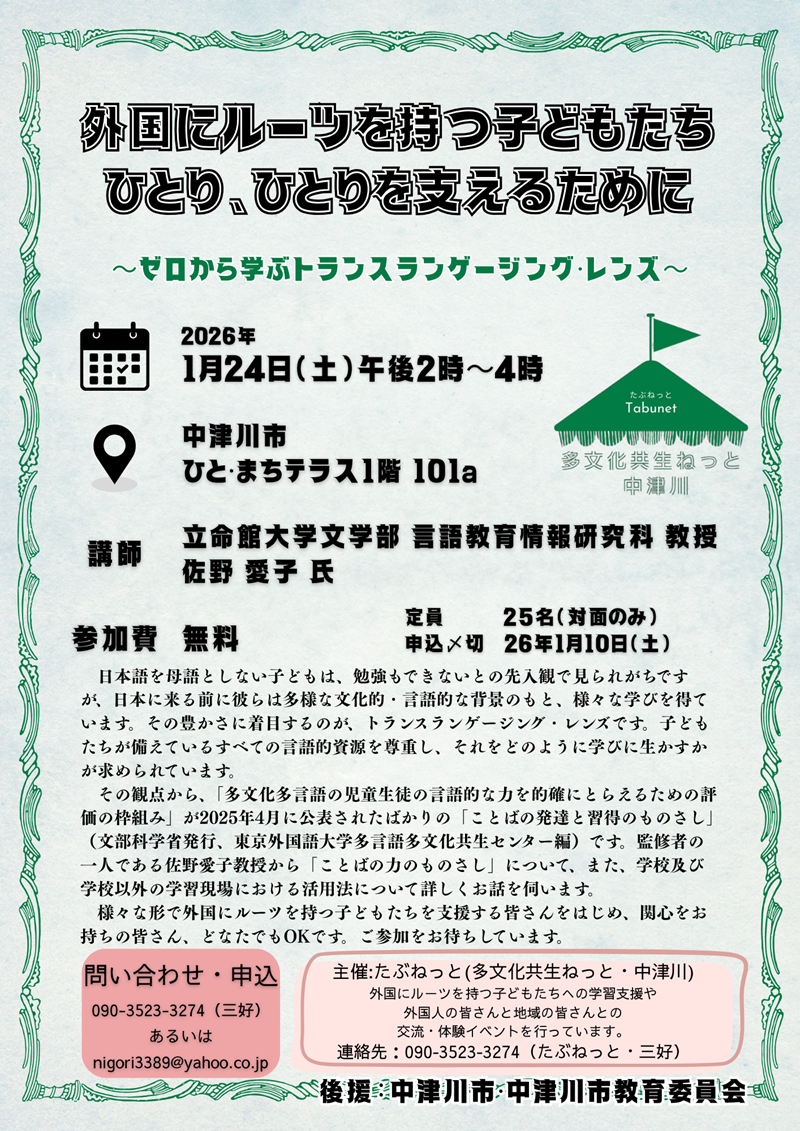 多文化共生ねっと・中津川(たぶねっと)よりお知らせです。