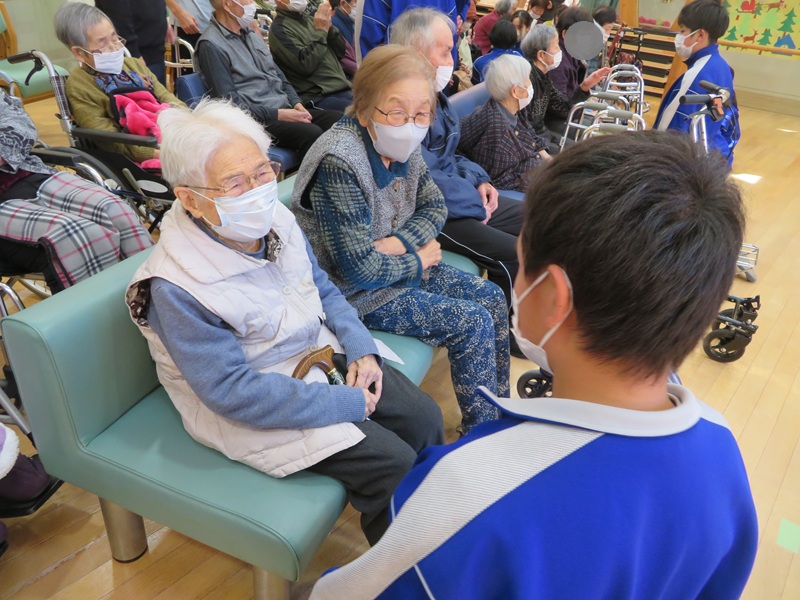 「ひーおばあちゃんの名前は?」「あ~知っとるよ!」など、みなさん笑顔で交流を深められました。 中学生のみなさんからパワーをもらうことが出来ました! |