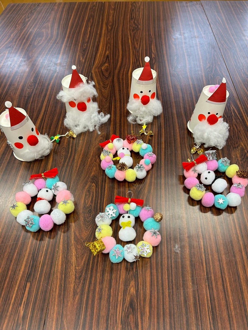 かわいいクリスマスリースとサンタさんが完成しました。 |