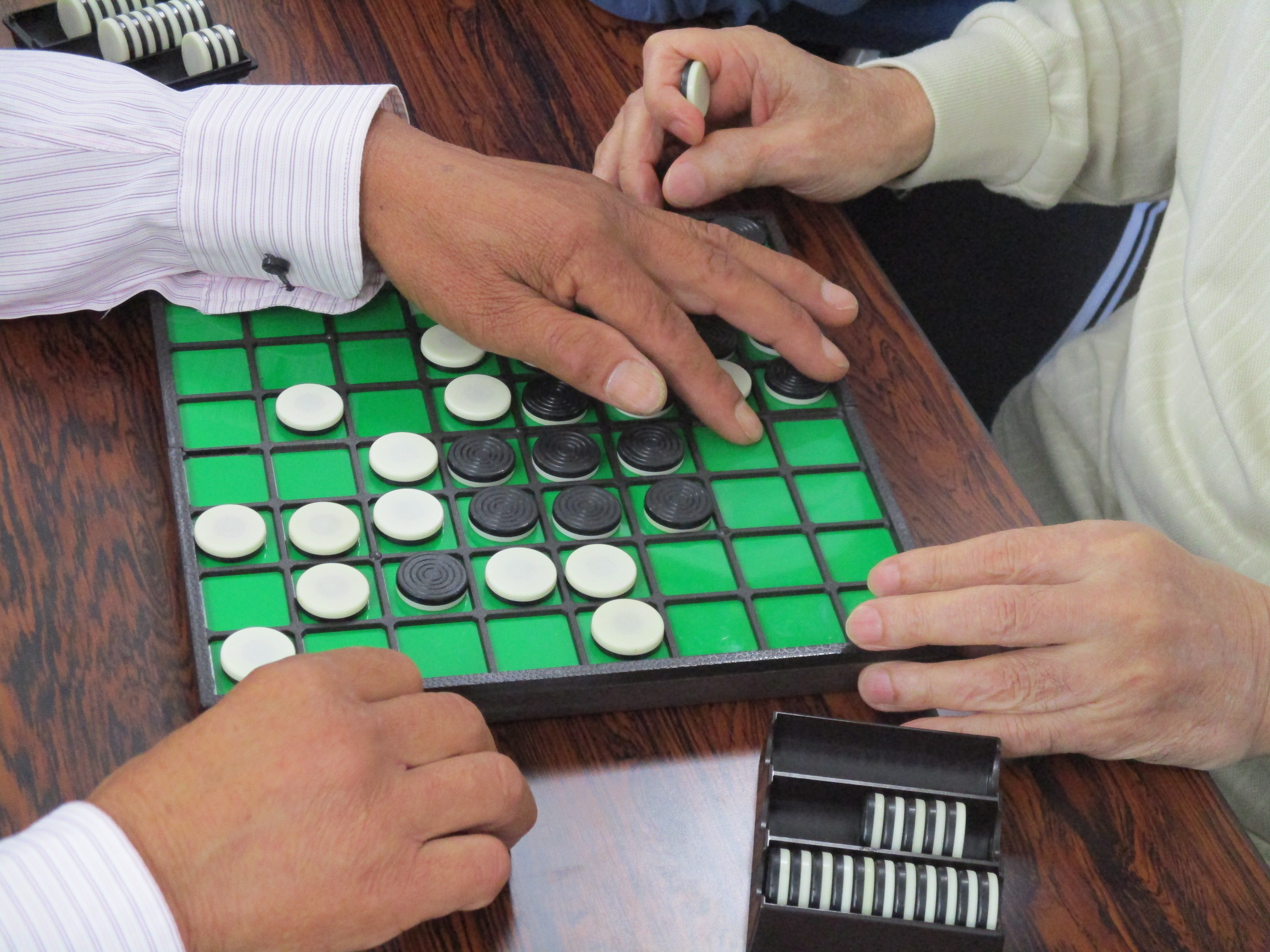 オセロ大会では6名の参加者がありました。オセロの駒は白と黒で肌触りが異なります。ガイドヘルパーの助言もあり、楽しい真剣勝負が繰り広げられました。 |