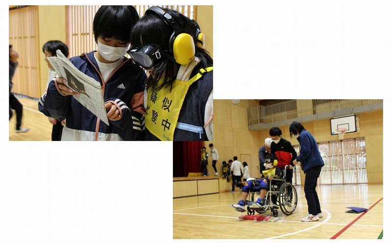 体験では、高齢者疑似体験セットをつけて、階段の上り下り、本や新聞を読むなどの体験を行いました。車いすの体験では、介助する時の声掛けや段差の上り方などを学びました。 |