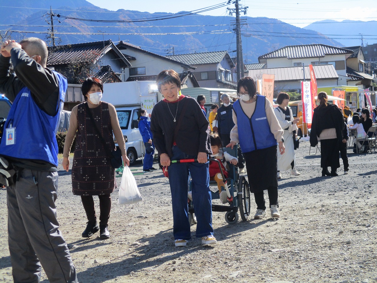 中津川市社協では、車いす牽引装置JINRIKIの体験と「自分たちができる安心のための取り組みを考えよう」テーマでコーナーを設置しました。