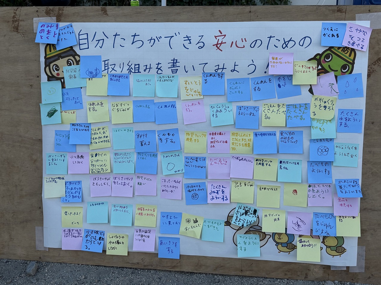 「自分たちができる安心のための取り組みを考えよう」というテーマで付箋にそれぞれに書いてもらいました。 「災害が起きる前から自分たちができることを考えておくこと、備えをしておくことが大切だと思った」などの感想がありました。
