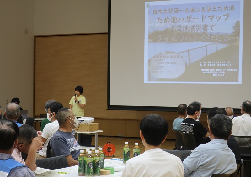 この研修会は苗木地域の社協、区長会、自主防災会、まち協、苗木事務所が一体となって防災について学ぶもので、今回はため池の防災と避難所運営についての研修をしました。
