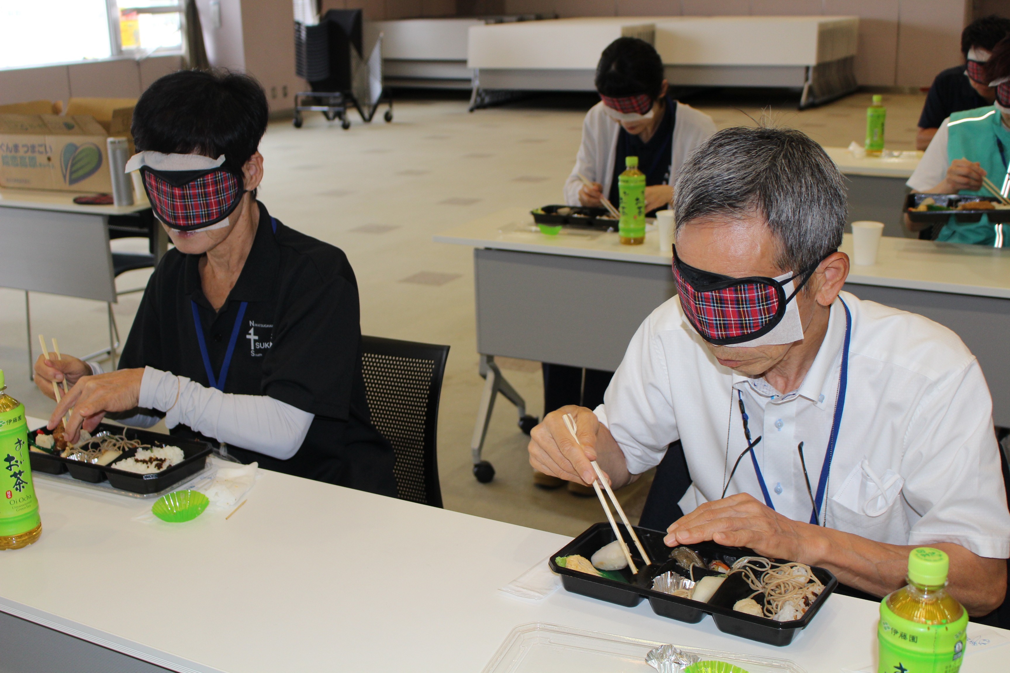 昼食の際には、受講者がアイマスクをしてお弁当を食べました。人間本来が必要としている感覚の80%以上を視覚が補っていると言われていますが、参加者はお弁当の中身が見えず箸での食事に悪戦苦闘しており、顏をお弁当に近づけたり指先でおかずを触って確かめたりしながら、なんとか完食しました。 |