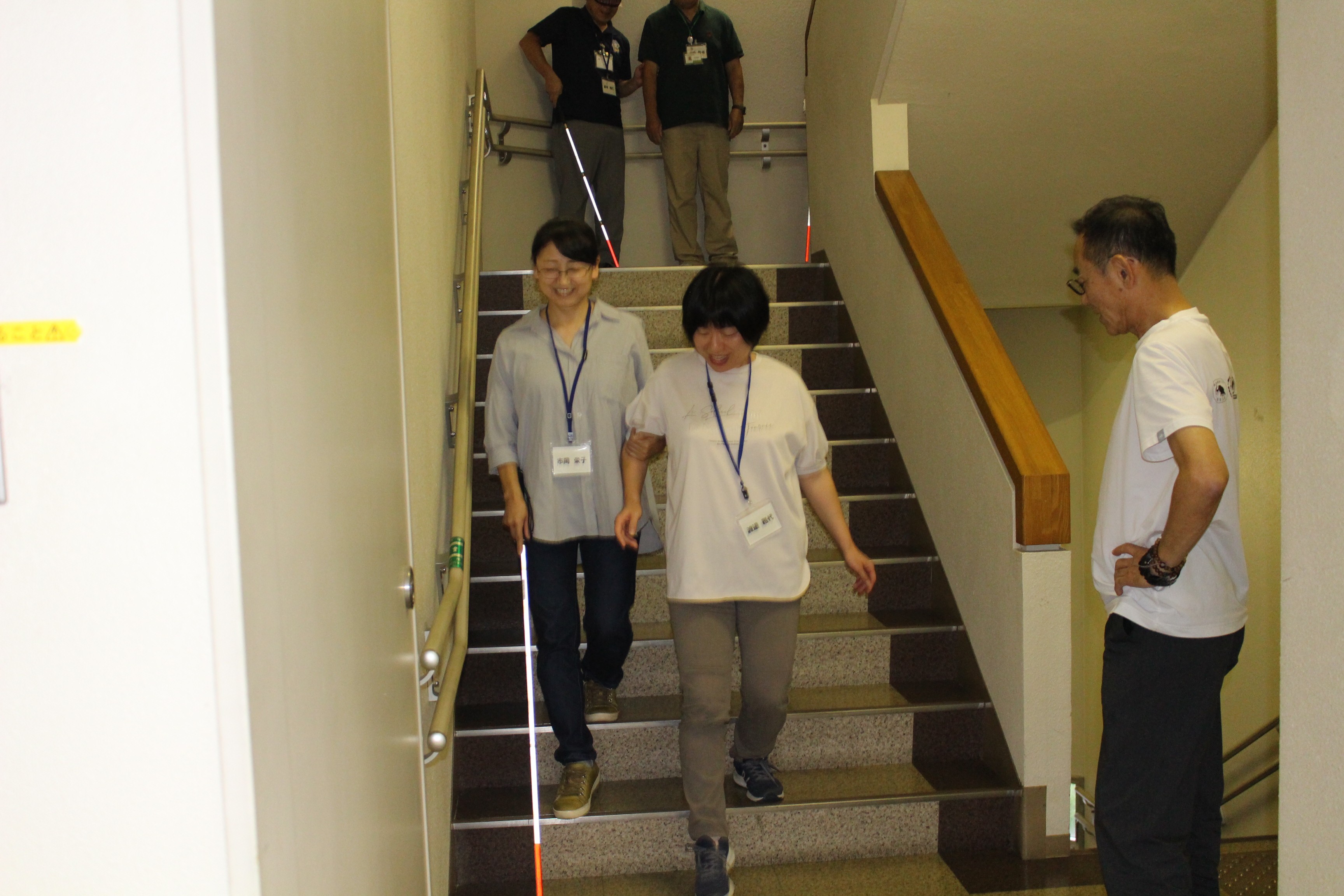 午後からは、白杖を使っての目かくし歩行や階段昇降などを体験し、参加者は、誘導役の方につかまりながら、恐る恐る足を進めていました。目が見えない状態での移動は危険が伴うため、視覚障がい者を誘導する方の役割が重要となります。誘導するにあたり、①安全性(安心感)、②能率性(効率的・効果的)、③見た目の自然さ、④両者にとってのやりやすさということがあり、「彼らの目の代わりになる」ためには、「彼らに正確な情報を分かりやすく伝える」ことが大切であることを学びました。 参加者からは、「目からの情報が日常生活においてどれほど大切か実感した」、「今回の体験から視覚障がい者のサポートに関してどんな配慮が必要か理解できた」などの感想をいただきました。 |