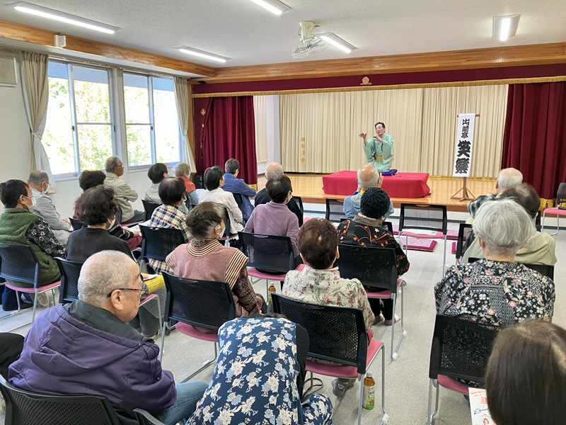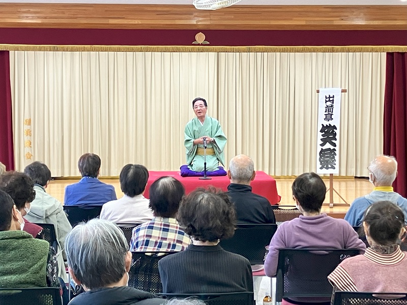 中津西地区の老人クラブでは会員や地域の高齢者を対象にした健康づくりや生きがいづくりに取り組んでおり、健康推進事業(マレットゴルフなど体を動かす活動)と文化推進事業(文化・芸能を楽しむ活動)を取組の柱にして活動を行っています。今回は文化推進事業の一環として落語家の 出前亭笑樂 さんによる独演会が開かれ、約40人が観覧しました。
