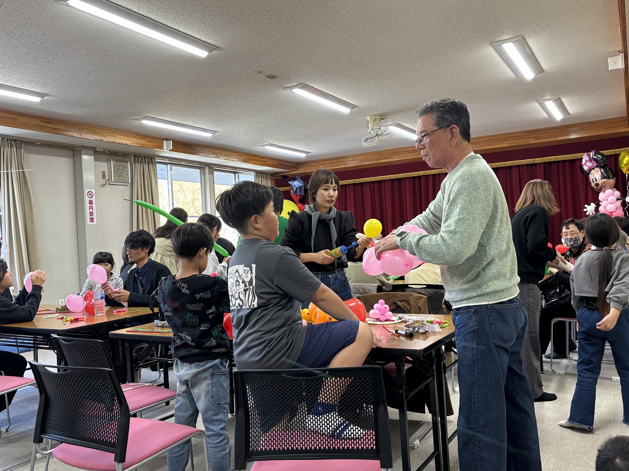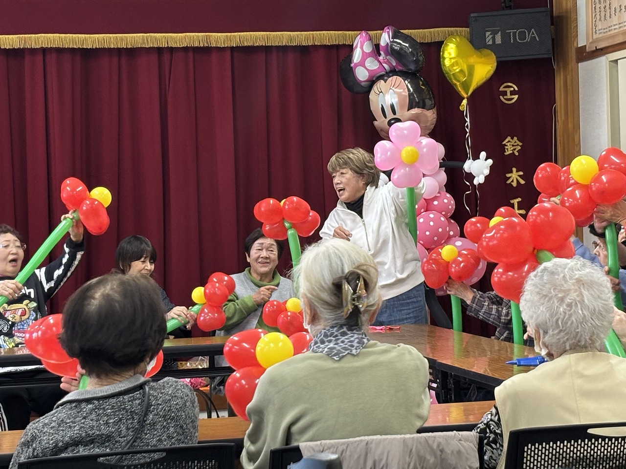 高齢者ふれあいサロンでバルーンアートを行うのを見て子どもたちから「自分たちもやってみたい」ということになり、区長さんが自らバルーンアートを教えてくれました。 |