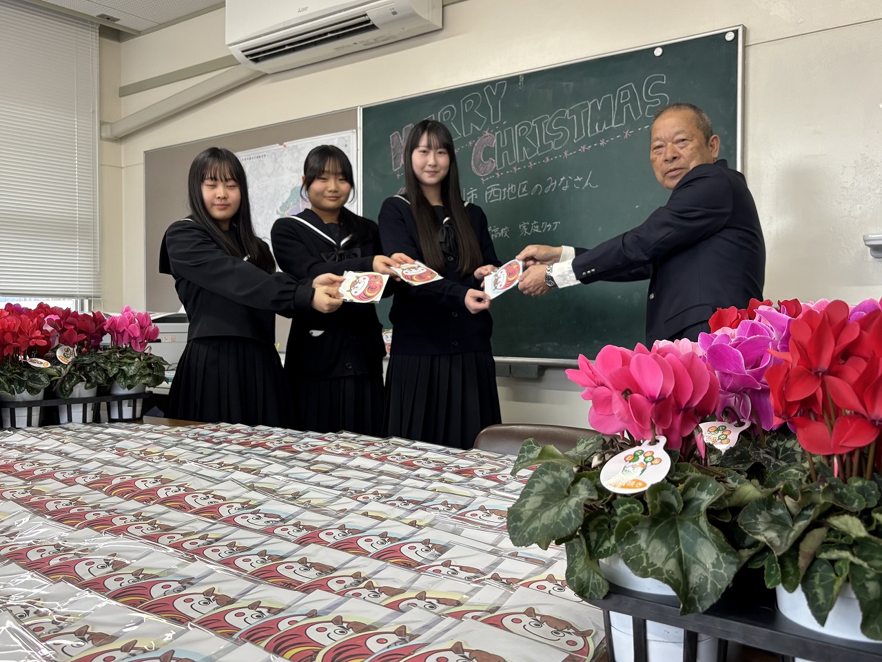 この生徒さんの心のこもったメッセージカードとシクラメンを手に、中津西地区の民生委員児童委員のみなさんが、担当地区のひとり暮らし高齢者のお宅を訪問しました。 |