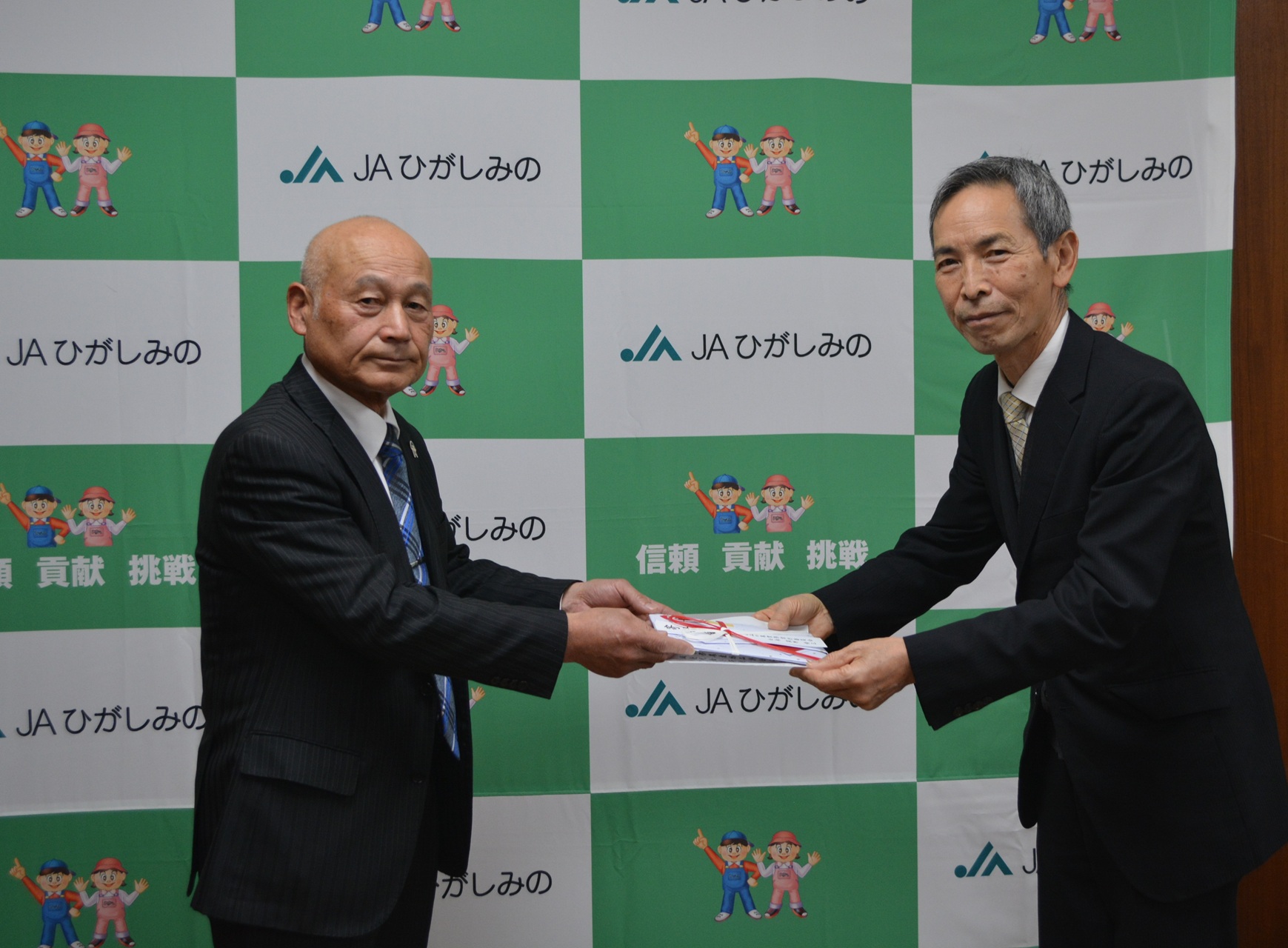 12月26日(金)、ひがしみの農業祭実行委員会会長 荻野修三 様(写真左)より、11月16日に開催された「第21回ひがしみの農業祭」の農産物品評会の売上げ70,815円を本会へご寄付いただきました。