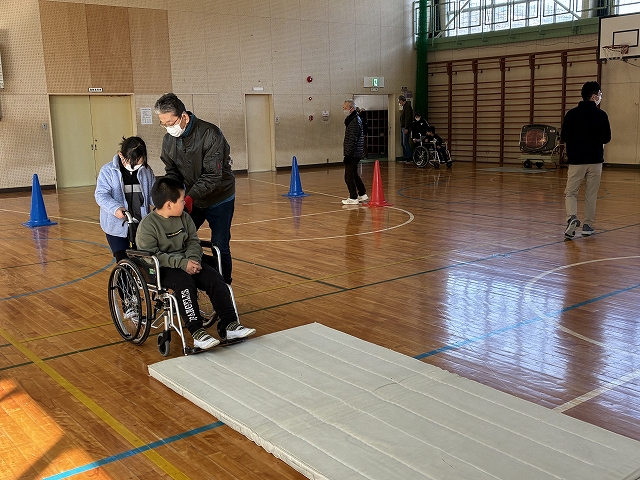 教室で高齢者の体の変化について学んだ後、体育館へ移動をし、車いすを使って自走をしたり、ペアで、くねくね道・段差・傾斜・抵抗のある路面など、4つのコースを体験しました。 |