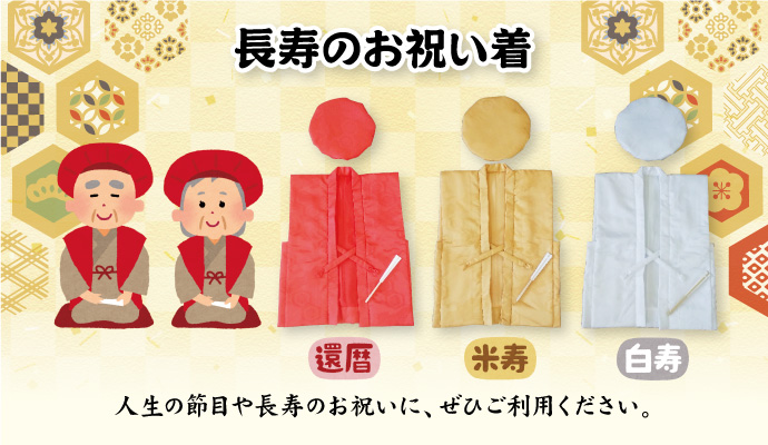 還暦・米寿・白寿のお祝い用のちゃんちゃんこの貸し出しも行っています。ご希望の方は、お気軽にお問い合わせください。