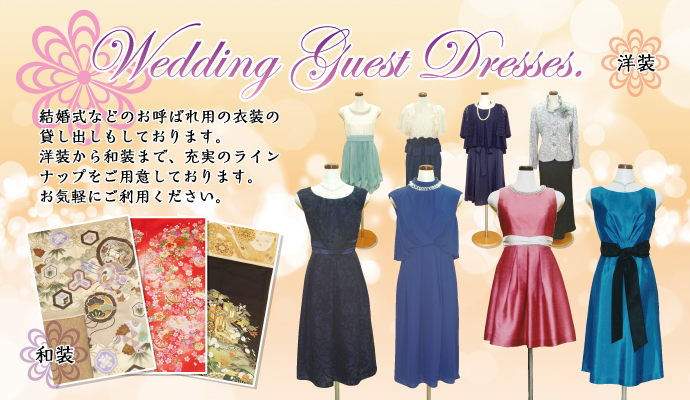結婚式やパーティなどの、お呼ばれ用衣装の貸し出しも行っております。見本の写真の他にも選べる衣装がありますので、お気軽にお問い合わせください。