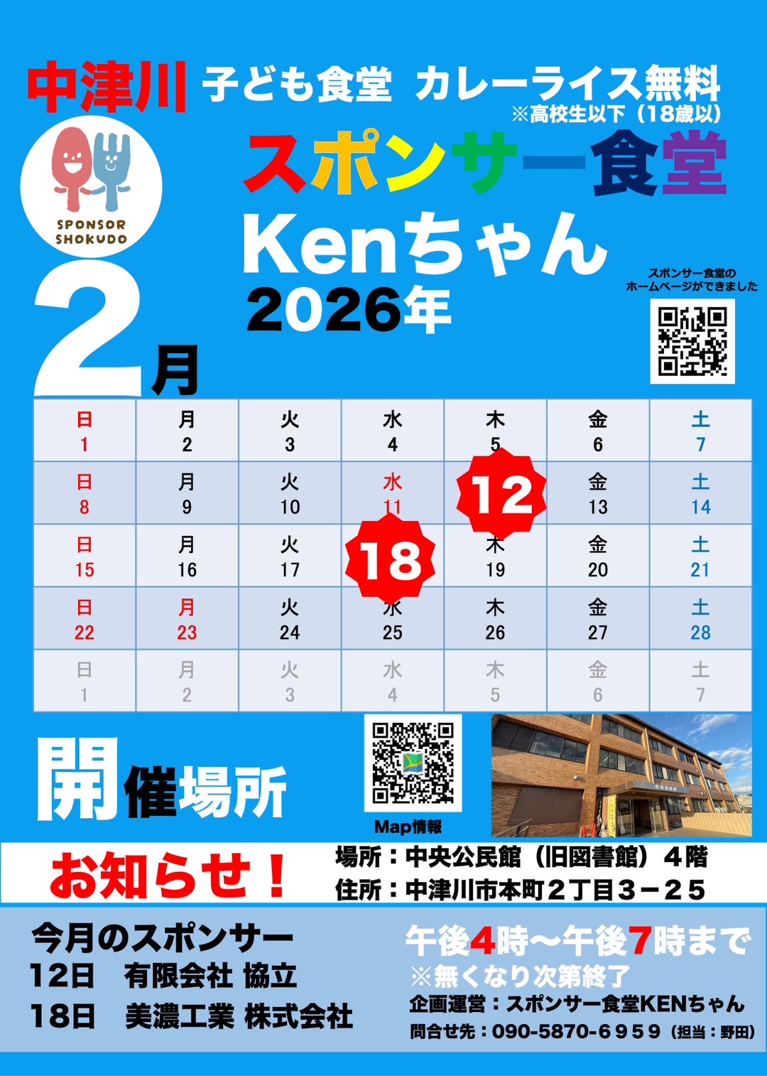 スポンサー食堂KENちゃん 2月開催のお知らせ(会場変更)