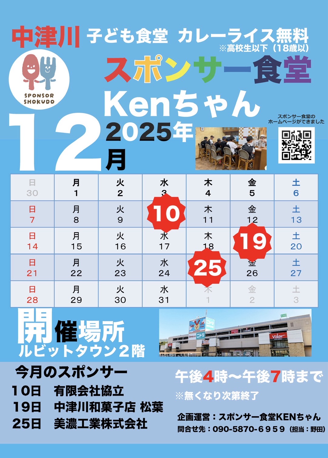 お知らせ 中津川スポンサー食堂KENちゃん 12月開催日のお知らせ!