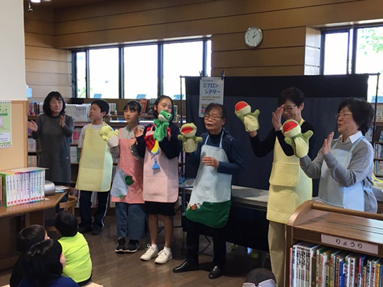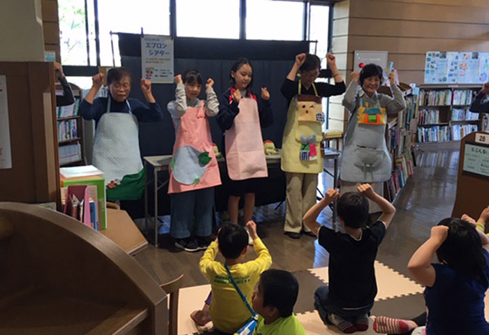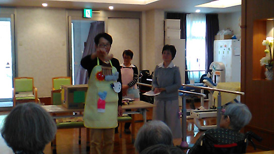 ●老人福祉施設、幼稚園・保育園・こども園においてエプロンを劇場にし、人形を使ってストーリーを演じる。